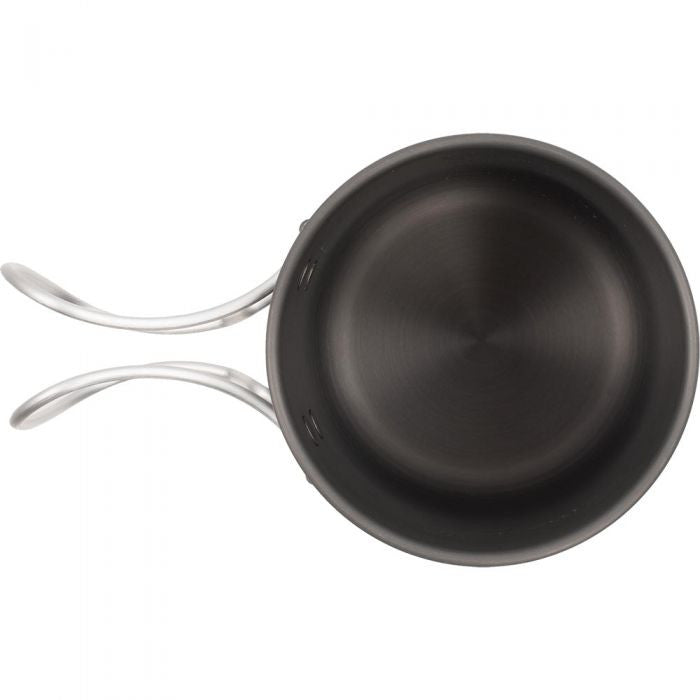 Lighter than our traditional Space Saver Mug,The Space Saver Mug with Grip fits snuggly over the bottom of a 1 quart, round Nalgene bottle and the Klean Kanteen 40 oz saving valuable space in your pack. Hard anodized surface makes this nearly scratch proof, easy to clean, and it looks great too. Large enough to boil water for freeze dried meals. The new innovative handle design keeps the handle cooler when used for boiling water or cooking. This will be your go-to pot for fast and light trips. Graduations on the side for measuring just the right amount of water. Holds 24 oz to the brim or 20 oz to the top graduation.