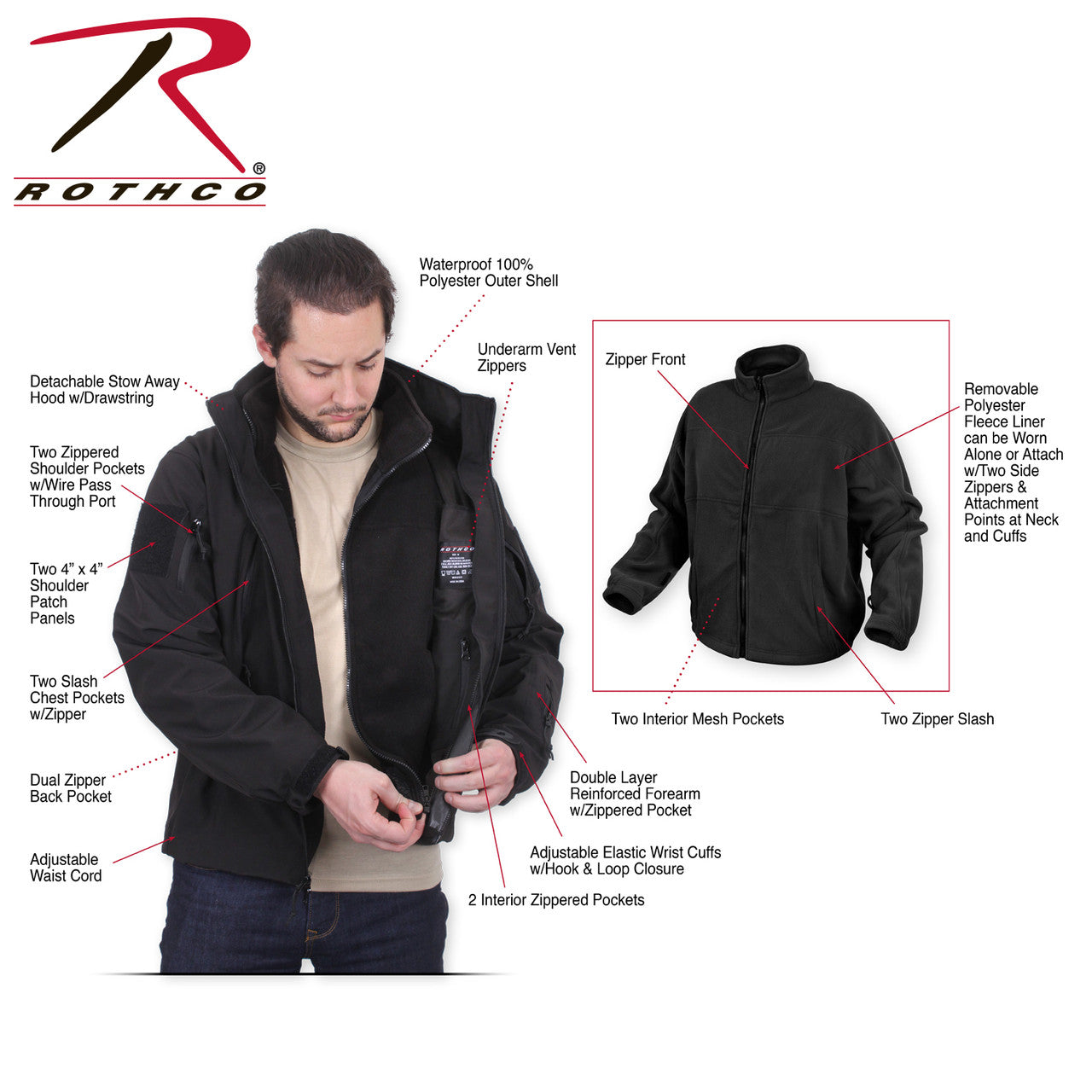 Rothco's 3-in-1 Spec Ops Soft Shell Jacket offers 3-season extreme cold weather protection with a tactical edge. The 3-in-1 jacket features 100% polyester waterproof outer shell with a warm removable fleece liner; wear them together or individually based on your climate conditions. The outer shell of the soft shell jacket is equipped with tons of storage options for all your essential gear; the jacket has two zippered shoulder pockets with wire pass through port, two slash chest pockets, dual zipper back pocket, two interior zippered pockets, and a double layer reinforced forearm zipper pocket. For a comfortable, customized fit, the tactical jacket features adjustable elastic wrist cuffs with hook & loop closure, adjustable waist cord and a detachable stow away hood with drawstring and underarm ventilation zippers. Each side of the jacket has a 4" x 4" shoulder loop field for hook & loop morale and insignia patches. The removable polyester fleece liner has a full-length zipper for attachment to the jacket as well as attachment points at the back of the neck and sleeve cuffs.