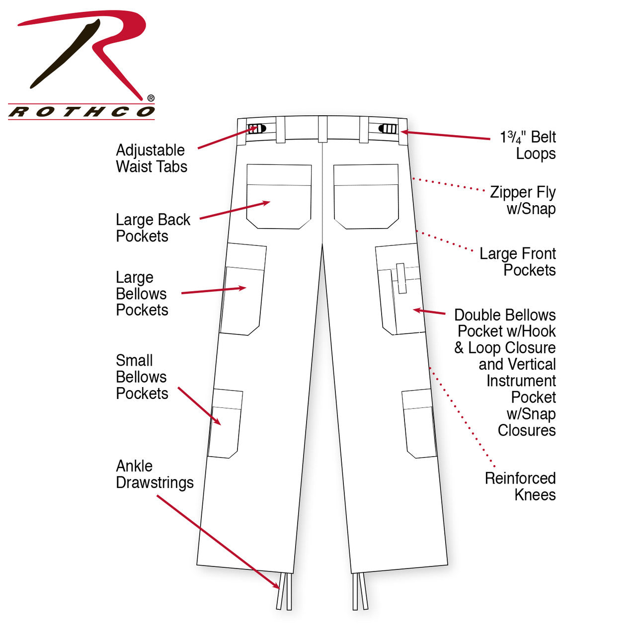 Rothco's EMT Pants offer an excellent value and are an extremely durable pant. The EMT pants are constructed with a rugged poly/cotton twill material that is pre-hemmed and ready to wear in short, regular & long lengths. The pants feature nine pockets, including slot pockets for scissors, flashlights, and other emergency services equipment, large back pockets, large front pockets, and a small bellows pocket.